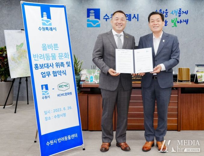 위촉식 후 수원시와 KCMC문화원은 ‘수원시 반려동물 교육도시 발전을 위한 업무협약’을 체결하고, 협력을 약속했다.
