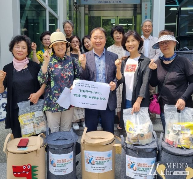 이날 활동에서는 10가구에 각 5만원 상당의 성인용 기저귀나 생리대를 다용도로 활용 가능한 천소재 바구니에 담아 전달했다.