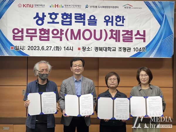 미디어아워 기자 | 복현1동, 산격3동 각 도시재생현장지원센터는 6월 27일 경북대학교 조형관에서 행복북구문화재단 및 경북대학교 미술학과와 ‘상호 협력 강화 업무협약(MOU)’을 체결했다.