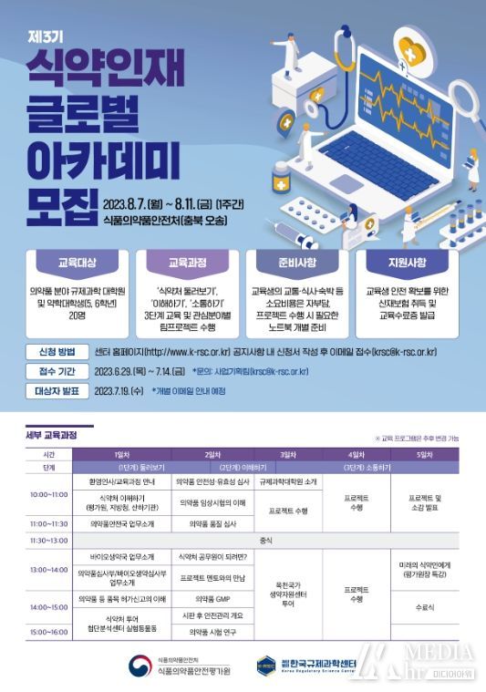 미디어아워 기자 | 식품의약품안전처는 약학대학생과 규제과학대학원생을 대상으로 의약품 분야 규제과학 인재를 양성하기 위해 ‘제3기 식약인재 글로벌 아카데미’ 참가자를 6월 29일부터 7월 14일까지 모집한다.