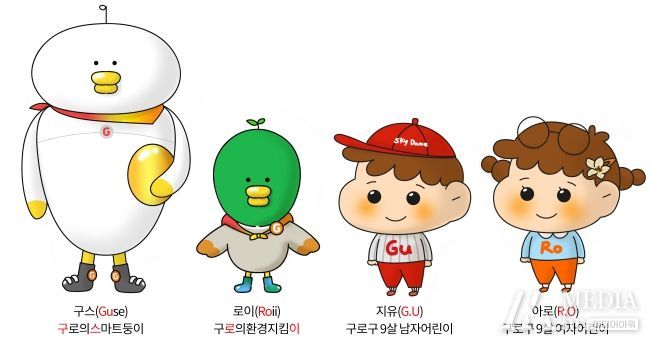 캐릭터 이름은 구로구의 색깔을 입혀 ‘구스(Guse)’, ‘로이(Roii)’, ‘지유(GU)’, ‘아로(RO)’라고 지었다.