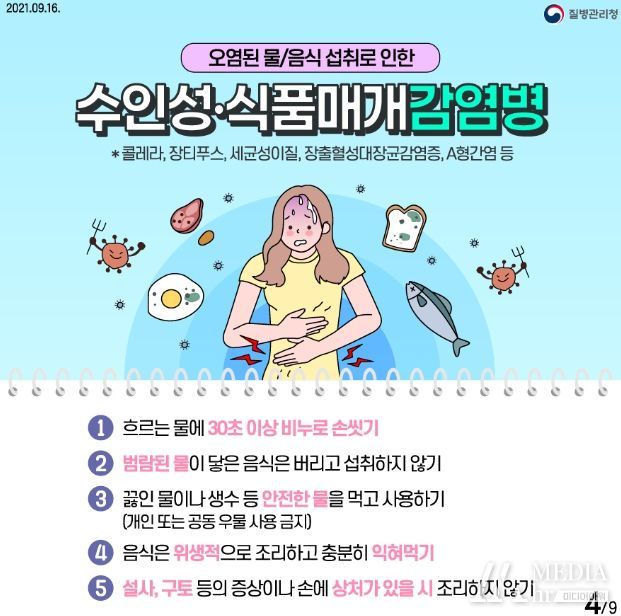 수해 발생 지역에는 하수관거 범람 등으로 오염된 물을 통해 장티푸스, 세균성 이질, A형간염, 노로바이러스, 장관감염증 등 수인성·식품매개 감염병에 노출될 수 있다.