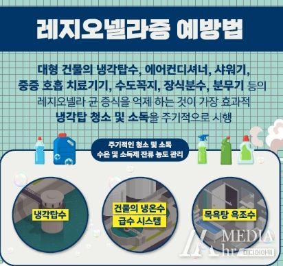 따라서 레지오넬라증을 예방하려면 ▲물이 고일 수 있는 곳을 소독하고 ▲냉방기와 가습기를 사용하기 전 필터 청소를 반드시 실시해 줘야 한다. 또한 호흡기 감염병인 만큼 주기적인 환기가 매우 중요하다.