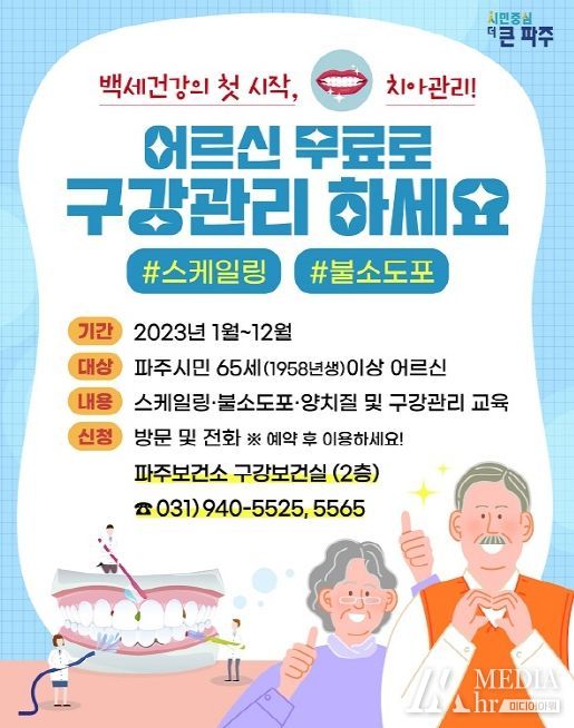 미디어아워 이다정 기자 | 파주보건소는 65세 이상 어르신을 대상으로 연중 무료로 스케일링과 불소도포를 실시한다.