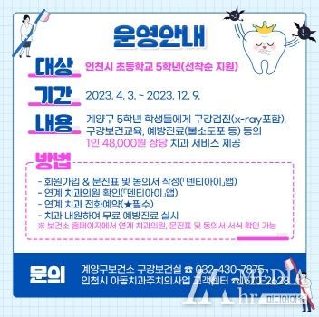 미디어아워 이다정 기자 | 인천광역시 계양구는 청소년기 학생들의 구강질환 예방을 위해 ‘아동치과주치의사업’을 추진한다.