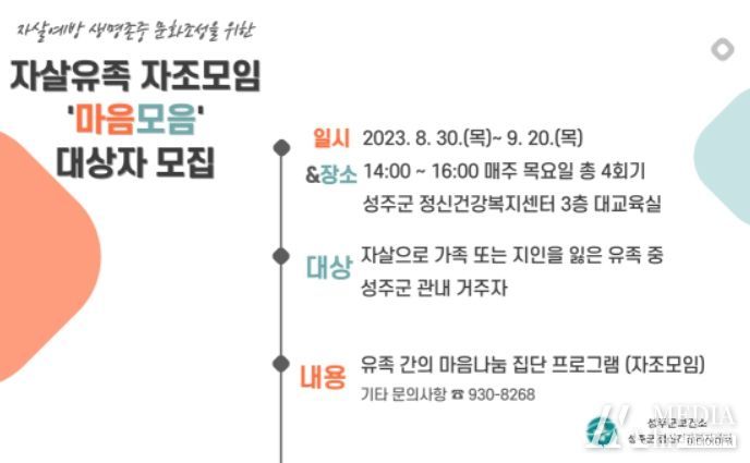 미디어아워 이다정 기자 | 성주군은 자살 유족의 건강한 애도를 돕고 마음을 치유하기 위한 ‘자살유족 자조 모임 마음 모음’ 참여자를 8월 1일부터 18일까지 2주간 모집한다.