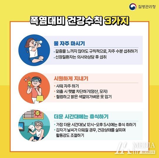 일상생활에서도 ▲선풍기, 에어컨 등 냉방장치 사용 ▲수건에 물을 적셔 몸을 자주 닦거나 가볍게 샤워하기 ▲한낮에는 가스레인지나 오븐 사용 피하기 ▲기온이 높은 낮 시간대 외출 자제하기 등의 주의가 필요하다.