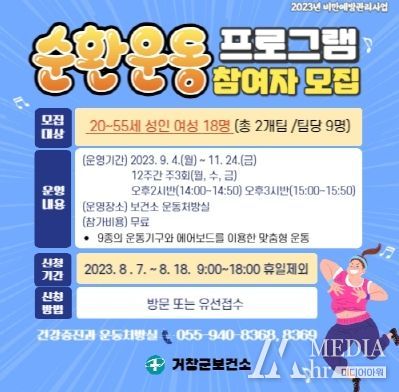 미디어아워 이다정 기자 | 거창군은 오는 7일부터 18일까지 2주간 비만예방관리사업 ‘순환운동 프로그램’ 참여자 18명을 선착순 모집한다.