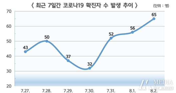 관내 코로나19 하루 평균 확진자는 6월 넷째 주 13.2명에서 7월 넷째 주 38.1명으로 292% 증가했다.