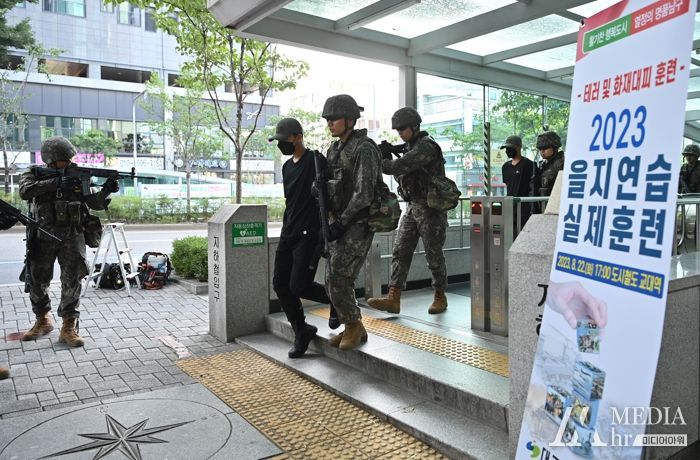 미디어아워 이다정 기자 | 대구광역시 남구청에서는 지난 22일 오후 5시, 도시철도 1호선 교대역에서 테러범의 폭발물 폭파에 의한 화재발생, 테러범 및 화재진압, 주민대피 등 테러 및 화재 대응 훈련을 주제로 한 『2023년 을지연습 실제훈련』을 실시했다고 23일 밝혔다.