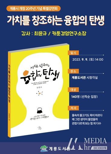먼저 9일 계룡도서관에서 열리는 저자 초청 강연회는 카툰경영연구소 최윤규 소장을 초청해 ‘가치를 창조하는 융합의 탄생’이라는 주제로 ▴4차산업 시대의 창조와 융합 ▴챗GPT 인공지능 시대의 질문하는 능력 ▴현상을 바라보는 다양한 관점과 시각의 중요성에 대해 강연한다.