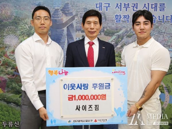 미디어아워 이다정 기자 | 대구 달서구는 지난 21일 사이즈짐(대표 최광현)으로부터 관내 어려운 아동들에게 지원해달라며, 후원금 100만원을 기탁 받았다고 밝혔다.
