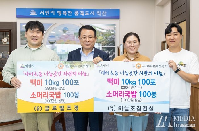 미디어아워 이다정 기자 | (유)하늘조경건설과 (유)글로벌조경은 지난 22일 익산시청을 방문하여 나눔곳간 이용자들을 위해 백미 10kg 200포(560만원 상당)와 소머리국밥 200봉(200만원 상당)를 기탁했다.