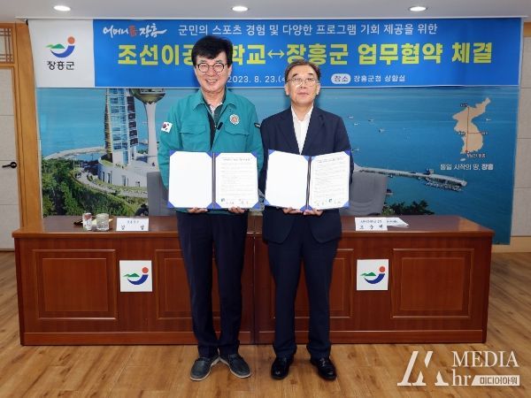 미디어아워 이다정 기자 | 장흥군은 23일 조선이공대와 장흥군민의 스포츠 경험 확대와 웰빙 헬스케어 제공을 위한 업무협약을 체결했다.