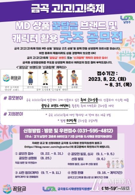 미디어아워 이다정 기자 | 남양주시는 도시재생‘꿈담금’브랜드 확산 및 금곡동 상권 활성화를 주도하고, 금곡 고고고축제 대표 MD 상품을 함께 만들 사업자를 발굴하고자 '금곡 도시재생 브랜드를 활용한 홍보 상품 공모전'을 개최한다.