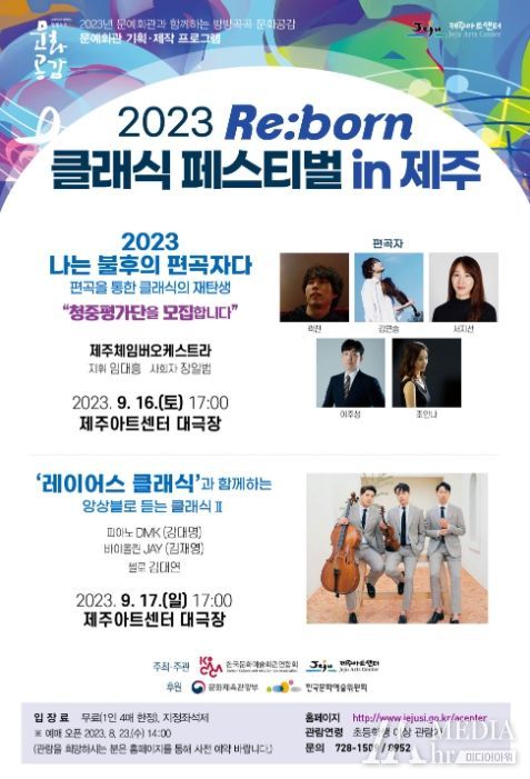 미디어아워 이다정 기자 | 제주아트센터는 문예회관 기획․제작 프로그램 '2023 Re:born 클래식 페스티벌 in 제주'의 일환으로 9월 16일 ‘나는 불후의 편곡자다’와 9월 17일 ‘레이어스 클래식과 함께하는 앙상블로 듣는 클래식’ 공연을 개최한다.
