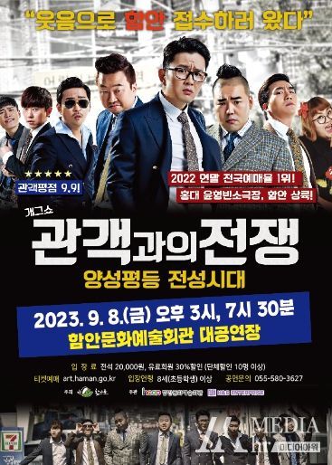 미디어아워 이다정 기자 | 버라이어티 개그쇼 ‘관객과의 전쟁’ 공연이 오는 9월 8일 오후 3시와 7시 30분에 함안문화예술회관 대공연장에서 열린다. 오후 3시에는 양성평등 주간 기념공연으로 진행되며 오후 7시 30분 공연은 일반관객에게 선보인다.