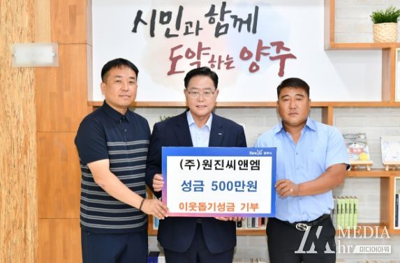 미디어아워 이다정 기자 | 양주시는 지난 22일 ㈜원진씨앤엠에서 시청을 방문해 관내 어려운 이웃을 돕는데 써달라며 성금 500만 원을 기부했다고 밝혔다.
