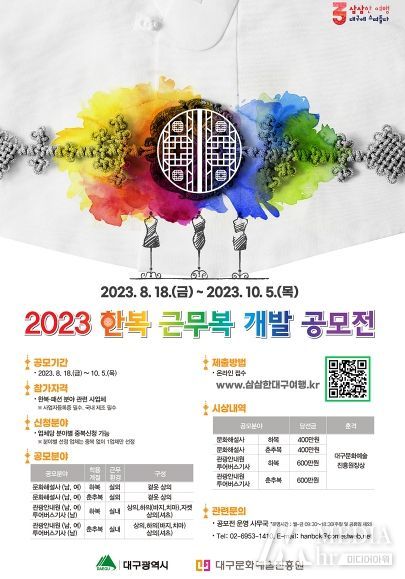 미디어아워 이다정 기자 | 대구광역시와 대구문화예술진흥원은 지역의 관광접점 지역에서 관광자원 안내 및 문화해설을 담당하는 실무 종사자의 근무복 개선과 해외 관광객의 환대 강화를 위해 ‘한복 근무복 개발 공모전’을 운영한다.