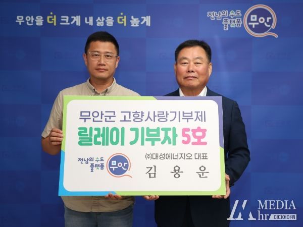 미디어아워 이다정 기자 | 전남 무안군은 고향사랑기부제의 성공적 안착을 위해 추진하고 있는‘무안군 고향사랑기부 릴레이’에 ㈜대성에너지오 김용운 대표와 대경스틸(주) 이병익 대표이사가 각각 5호, 6호로 참여했다고 23일 밝혔다.