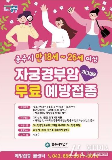미디어아워 이다정 기자 | 충주시는 자궁경부암을 예방할 수 있는 인유두종바이러스(HPV) 무료 예방접종을 독려하고 나섰다.