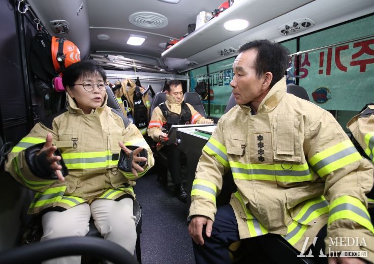 미디어아워 이다정 기자 | 이순희 서울 강북구청장은 23일 오후 을지연습 민방공 훈련의 일환으로 실시한 소방차 긴급비상차로 확보 훈련에 참여하고 관계자들을 격려했다.