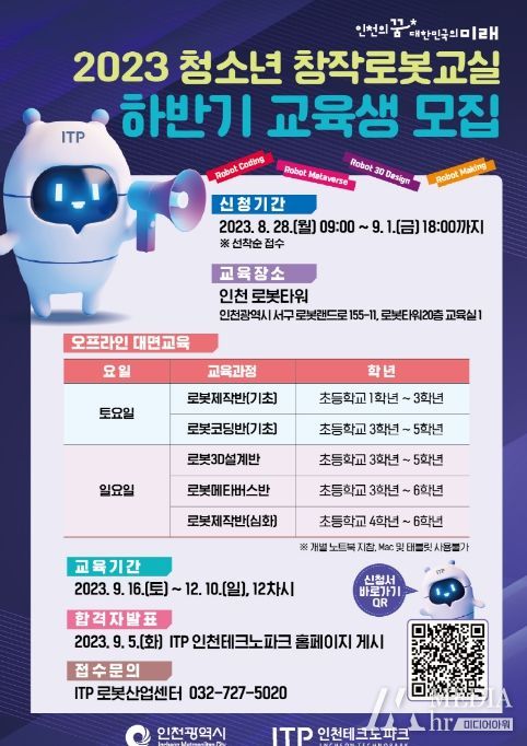 미디어아워 이다정 기자 | 인천테크노파크(인천TP)는 미래 로봇산업을 선도할 꿈나무 육성을 위해 ‘2023 하반기 청소년 창작로봇교실’을 9월부터 12월까지 운영하며, 오는 28일부터 수강생 100명을 선착순 모집한다고 밝혔다.