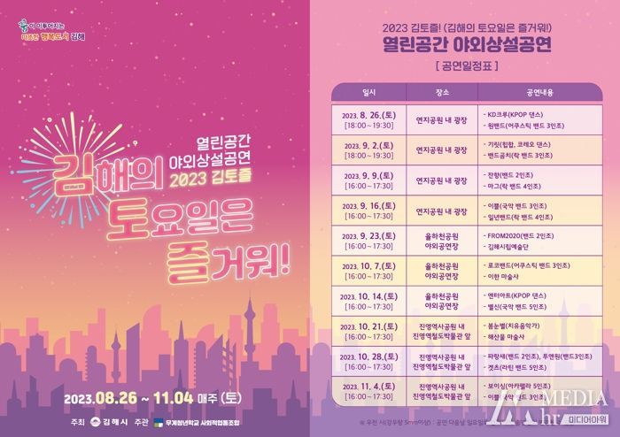 미디어아워 이다정 기자 | 김해시는 오는 26일부터 11월 4일까지 10주간 매주 토요일 김토즐(김해의 토요일은 즐거워!) 열린공간 야외상설공연을 개최한다고 밝혔다.