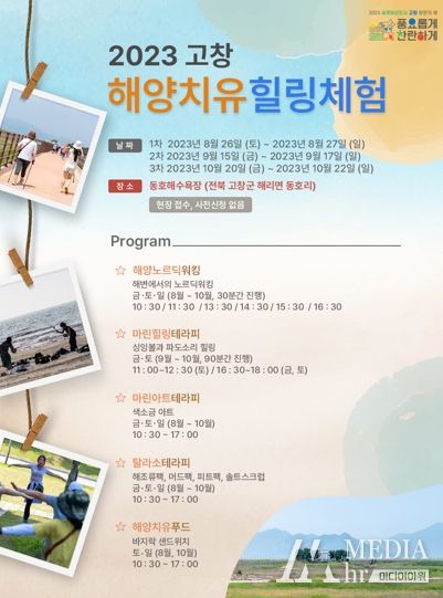 미디어아워 이다정 기자 | 고창군이 동호해수욕장 일원에서 ‘힐링’을 주제로 하반기 해양치유 힐링체험을 3차례 운영한다고 24일 밝혔다.