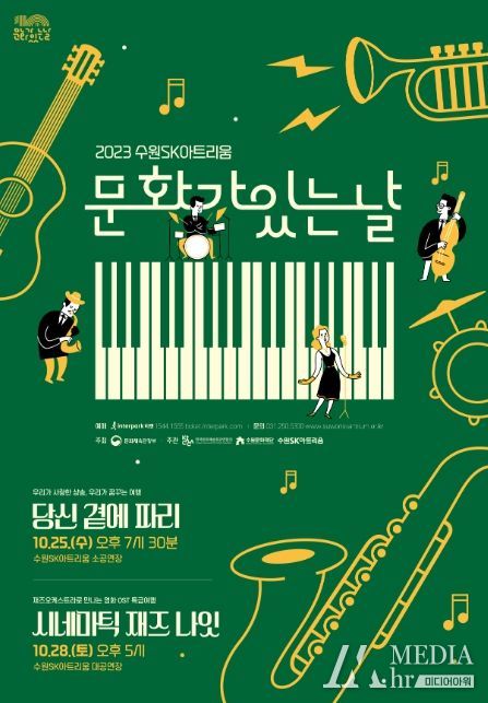 미디어아워 이다정 기자 | 수원문화재단 수원SK아트리움은 오는 10월 ‘문화가 있는 날(매월 마지막 주 수요일)’ 주간을 맞아 ‘음악으로 떠나는 여행’을 주제로 10월 25일 '당신 곁에 파리'와 10월 28일 '시네마틱 재즈 나잇' 각각 기획공연 두 편을 선보인다.