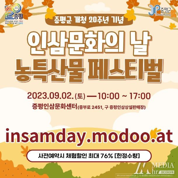미디어아워 이다정 기자 | 증평군이 9월 2일 증평인삼문화센터 앞 광장에서‘인삼문화의 날 농특산물페스티벌’을 개최한다.