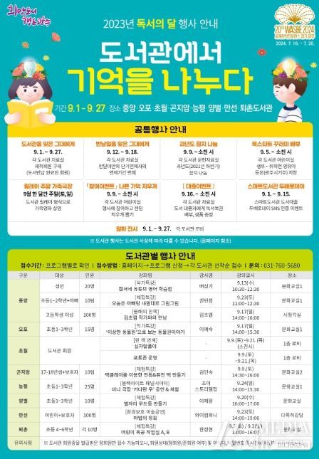 시 관계자는 “책 읽기 좋은 9월에 도서관에서 가족들과 즐거운 기억을 함께 나누는 뜻깊은 한 달이 되기를 기대한다”고 말했다.