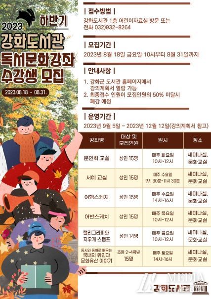 미디어아워 이다정 기자 | 강화군은 지역주민의 독서문화 활성화와 생애 주기별 평생교육의 장 마련을 위해 강화군도서관에서 ‘하반기 독서문화프로그램을’ 운영한다.