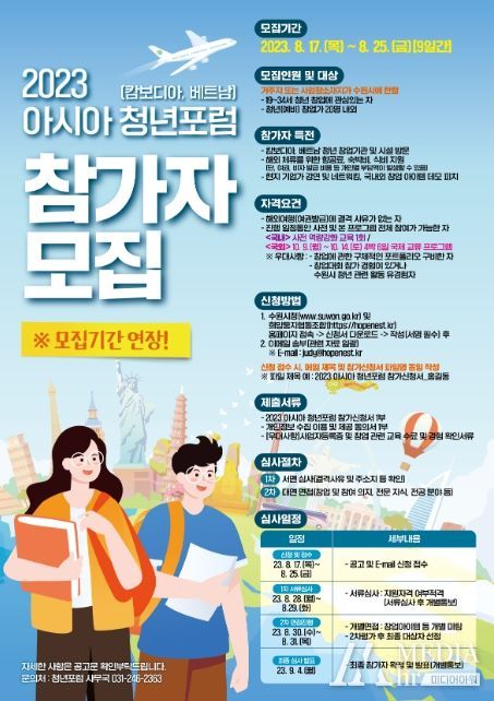미디어아워 이다정 기자 | 수원시가 ‘2023 아시아 청년포럼’에 참가할 청년 (예비)창업가를 8월 25일까지 추가 모집한다.