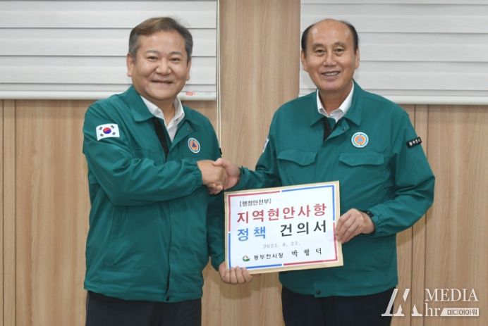 미디어아워 이다정 기자 | 박형덕 동두천시장은 지난 23일 동두천 시민회관에서 이상민 행정안전부장관을 면담하고 정부의 미군 공여지 반환 지연에 따른 행정안전부의 대책을 촉구하는 건의문을 전달했다.
