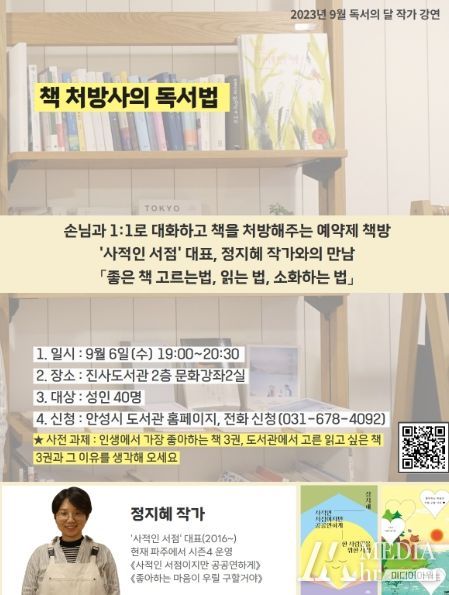 미디어아워 이다정 기자 | 안성시 진사도서관에서 9월 6일(수) 오후 7시에 ‘사적인 서점’ 대표인 정지혜 작가를 초청하여 ‘책 처방사의 독서법’ 강연을 진행한다.