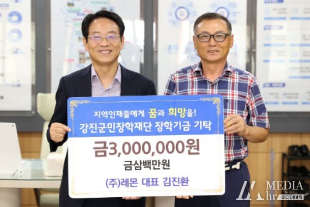 미디어아워 이다정 기자 | 강진군은 ㈜레몬 김진환 대표가 22일 장학금 300만 원을 강진군민장학재단에 기탁했다고 밝혔다.
