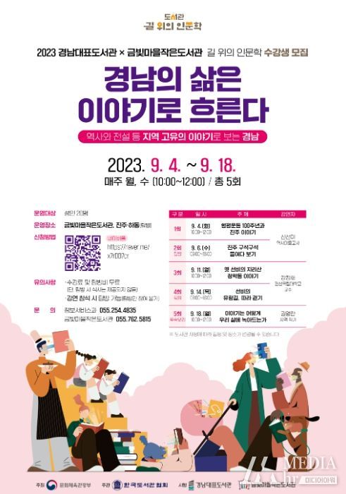 미디어아워 이다정 기자 | 경남대표도서관은 2023년 ‘길위의 인문학’ 운영 도서관으로, 오는 9월 4일부터 9월 18일까지 ‘경남의 삶은 이야기로 흐른다’라는 주제로 진주 금빛마을작은도서관에서 인문학 프로그램을 운영한다.