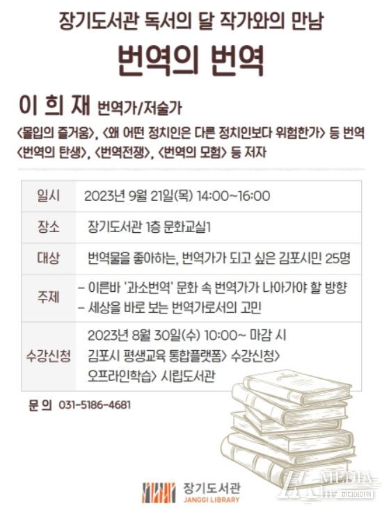 미디어아워 이다정 기자 | 김포시 장기도서관은 독서의 달인 9월 21일 오후 2시, 전문번역가 이희재 씨를 초청해 ‘번역의 번역’을 주제로 강의를 연다.