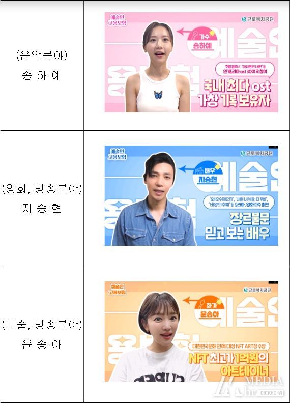 미디어아워 이다정 기자 | 근로복지공단(이사장 박종길)은 각 예술분야에서 활발한 활동을 하고 있는 송하예(가수), 지승현(배우), 윤송아(화가 겸 배우, 홍대교수)가 예술인 고용보험제도 안내 동영상 촬영을 통해 선한 영향력을 펼쳤다고 24일 밝혔다.