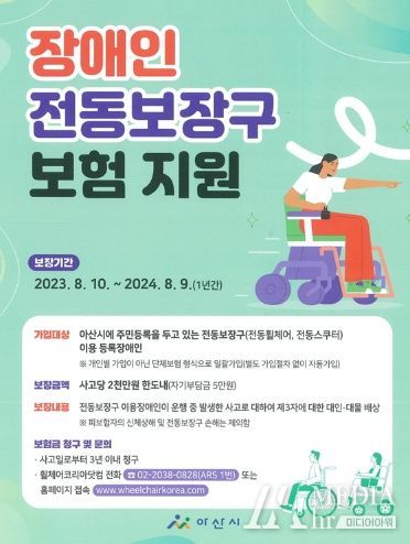 미디어아워 이다정 기자 | 아산시는 장애인 전동보장구(전동휠체어, 전동스쿠터)를 이용하는 관내 등록장애인을 대상으로 ‘전동보장구 배상책임보험’을 지원한다고 밝혔다.