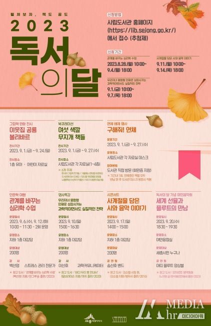 미디어아워 이다정 기자 | 세종시립도서관이 ‘9월 독서의 달’을 맞이해 시민들을 대상으로 초청 강연, 여민 음악회, 문화공연 등 다채로운 독서문화 진흥행사를 진행한다.