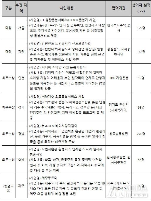 미디어아워 이다정 기자 | 보건복지부와 한국노인인력개발원(원장 김미곤)은 ‘사회서비스형 선도모델’노인일자리 시범사업의 2022년 실적을 평가하여 7개 모형을 우수 사업으로 선정했다고 밝혔다.