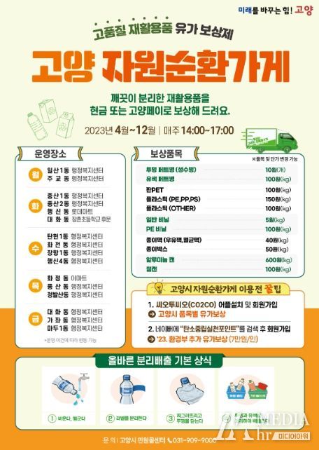 미디어아워 이다정 기자 | 고양특례시가 시민이 재활용품을 배출하면 인센티브를 제공하는 ‘자원순환가게’를 9월부터 확대 운영한다. 확대 운영에 따라 장소도 2개소가 늘어나고 취급하는 재활용품 품목도 늘어난다.