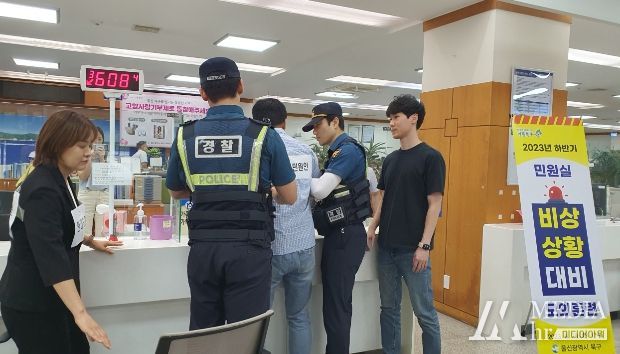 미디어아워 이다정 기자 | 울산 북구는 지난 29일 경찰과 합동으로 하반기 민원실 비상상황 대비 모의훈련을 실시했다.
