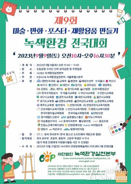 미디어아워 이다정 기자 | 안양시 만안구 삼덕공원에서 다음달 9일 ‘제9회 녹색환경 미술·만화·포스터·재활용품만들기 전국대회’가 개최된다.