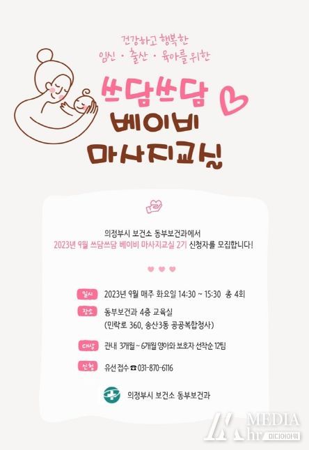 미디어아워 이다정 기자 | 의정부시 보건소는 9월 영아의 성장 촉진과 면역력 향상을 위한 ‘쓰담쓰담 베이비 마사지교실’을 운영한다.