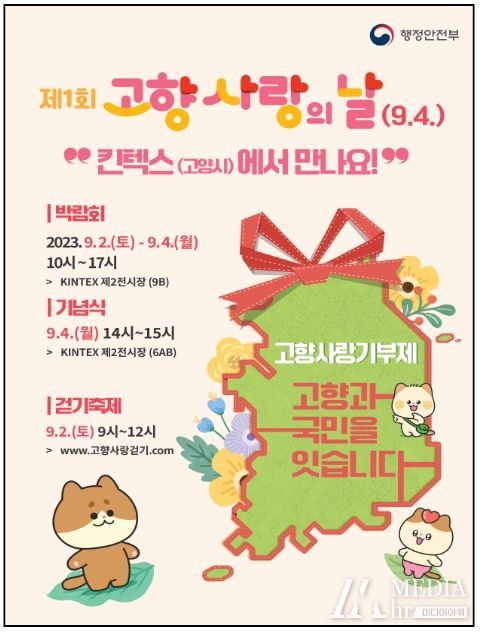 행정안전부는 9월 4일, 일산 킨텍스(경기도 고양시 소재)에서 ‘고향사랑기부제, 고향과 국민을 잇습니다’라는 주제로 '제1회 고향사랑의 날 기념식'을 개최한다고 밝혔다.