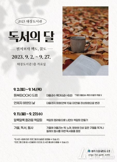 미디어아워 이다정 기자 | 태장도서관은 책과 함께하기 좋은 가을을 맞이해 시민들을 위한 다채로운 독서의 달 행사를 운영한다.