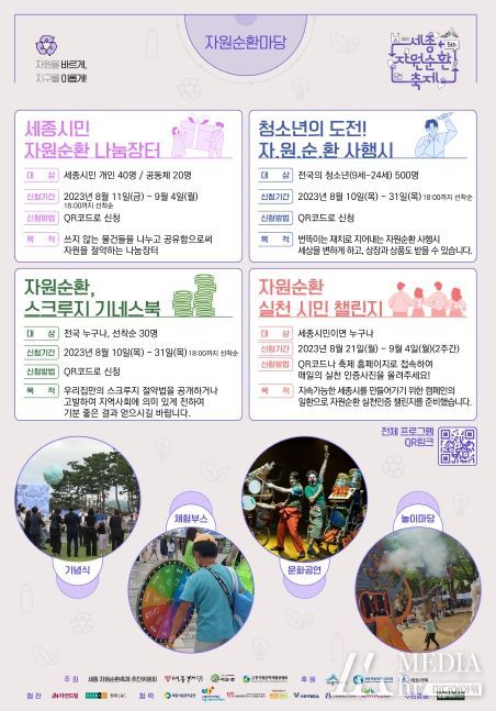 미디어아워 이다정 기자 | 나눔장터, 자원순환 실천 챌린지, 환경 문화공연 등 다양한 프로그램으로 구성된 ‘2023 세종자원순환축제’가 오는 9일 세종호수공원 일대에서 성대하게 열린다.